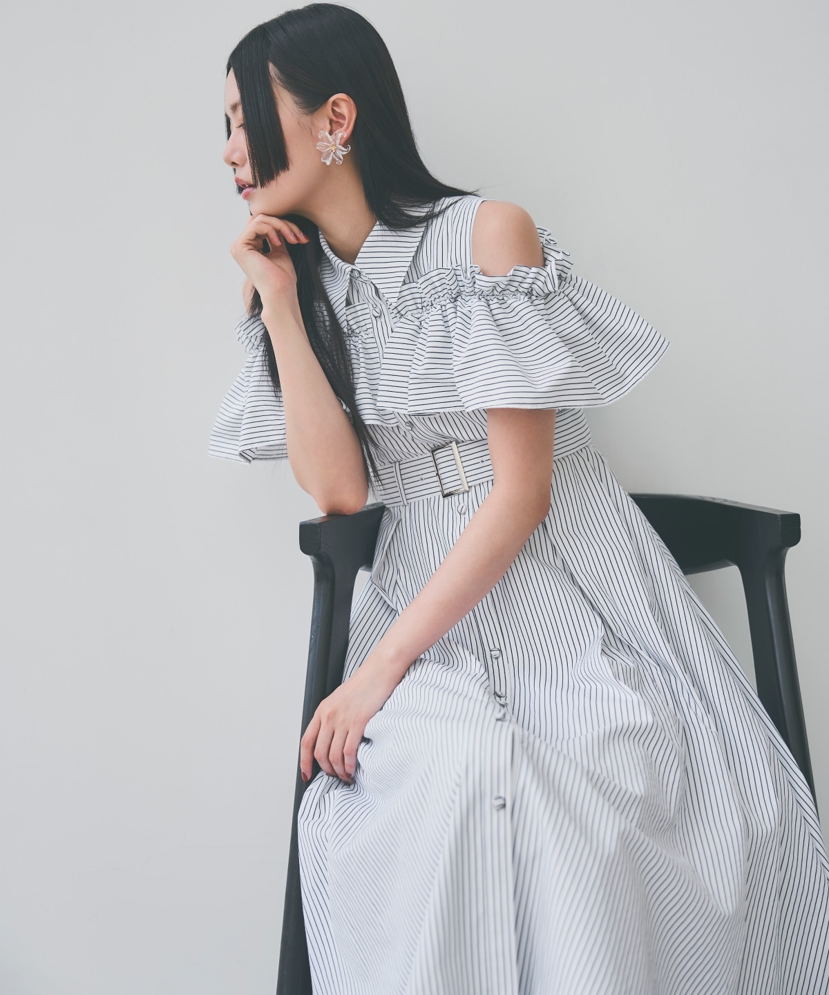 ストライプが爽やかなワンピースです!肩の出るタイプのワンピースになっておりますが、腕の1番嫌なところはしっかり隠してくれて、華奢見えしてくれると思います!また、付属のベルトでしっかりウエストマークしてくれるため、スタイルアップ効果も大で、すっきり着ていただけます。