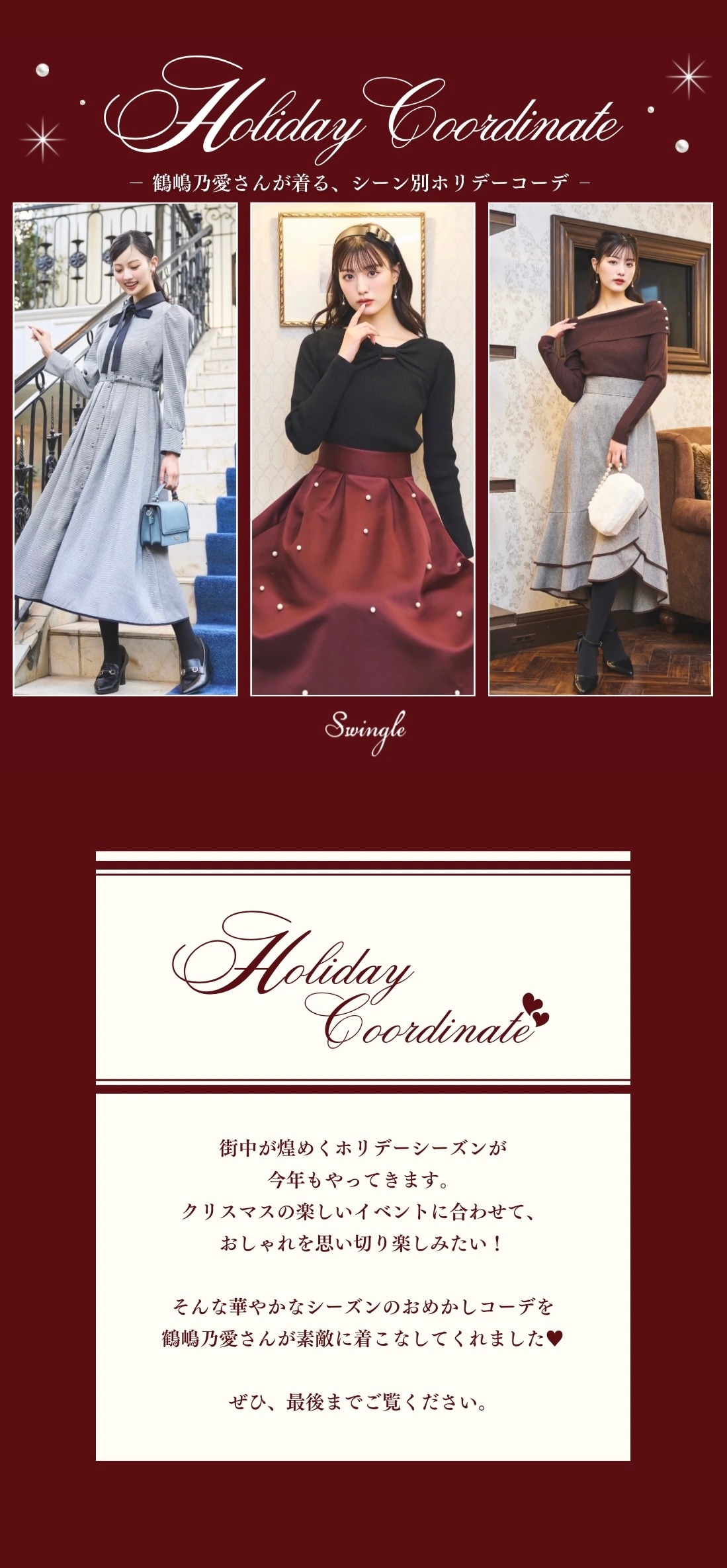 【Swingle】Holiday Coordinate - 鶴嶋乃愛さんが着る、シーン別ホリデーコーデ -