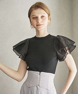 異素材ダブルフレア袖ノースリプルオーバー |