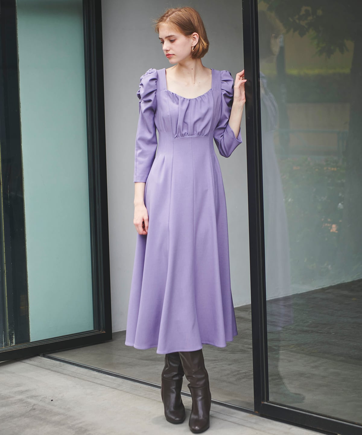 スクエアネックギャザーワンピース |