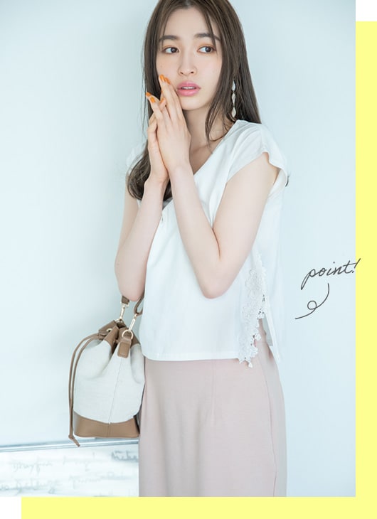 Tops ¥5,940 Skirt ¥9,900 Bag ¥6,380 Sandals ¥11,990 Earrings ¥3,190